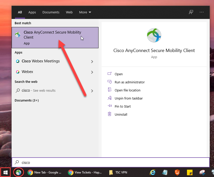 Step 1. Click the Start menu (denoted by the red box) and type 'Cisco AnyConnect', as denoted by the red arrow; the red circle denotes the Desktop/Taskbar icon. Once you see Cisco AnyConnect under Best match, click on it.