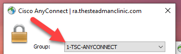 Step 3. For TSC employees, the Group dropdown must match the image below, displaying 1-TSC-AnyConnect.