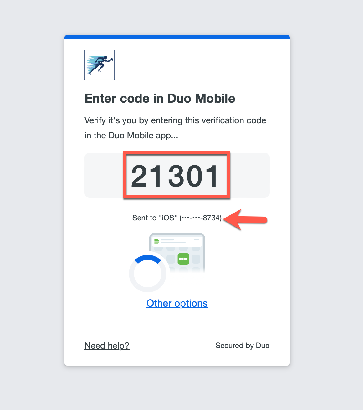 Step 10. Upon completing step 9, you will be presented with a code that must be entered into Duo Mobile, as seen below. The phone number indicated by the red arrow denotes the line where the application is installed; if Duo Mobile is installed on your personal device, and you have a work cellphone, please let us know with a Helpdesk ticket.