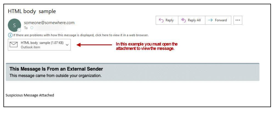 Note: In some instances, the banner may not appear; rather, it will be an attachment to the email, as determined by the sender's outbound email settings. This can be seen in the example below.