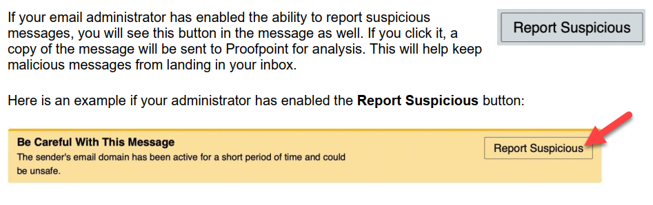 We will also be including a feature within ProofPoint that allows you to easily flag suspicious emails. It can be seen below, as noted by the red arrow, in the form of a "Report Suspicious" button located within the warning banners tied to external emails you receive. Should you believe an email is suspicious, please use this button before you interact with said email in any way!