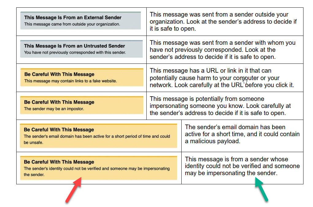 The messages in the left column, as noted by the red arrow, are the messages that will be displayed as a banner in an email that did not originate within our organization, while the right column, as noted by the green arrow, is a detailed description of what each banner denotes; the banner presented will be determined by the factors outlined in the corresponding column.