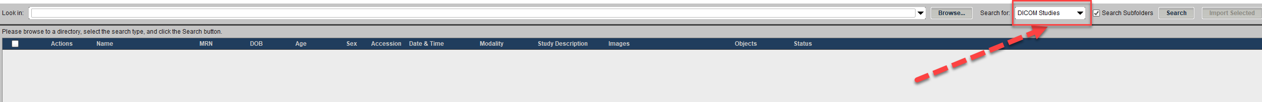 - In the “Local Study” window select type of study to look for (Format of images) – DICOM or Non-DICOM.
