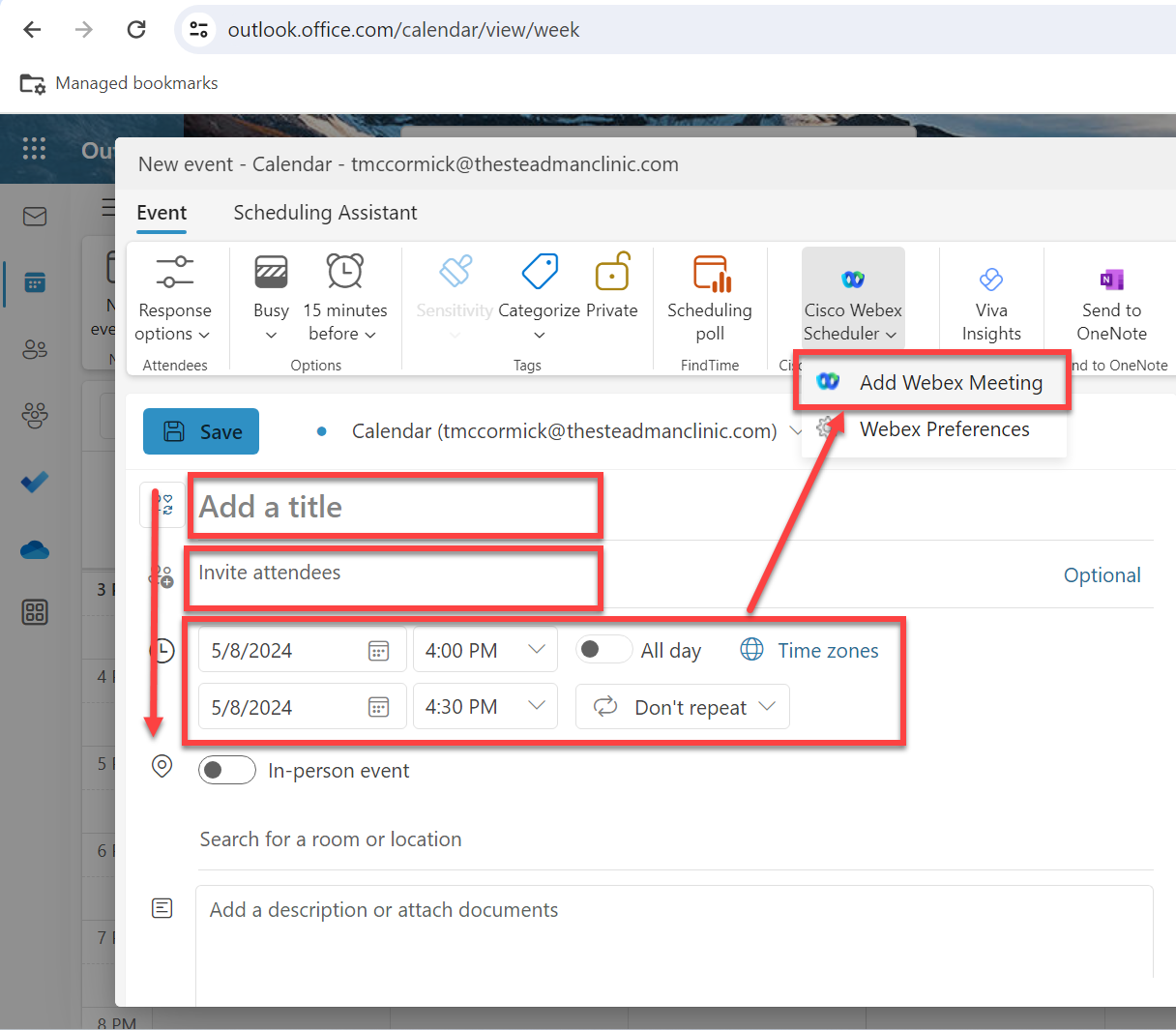 Step 5. Add a title, Invite attendees, specify the time of the meeting, then click Add Webex Meeting.