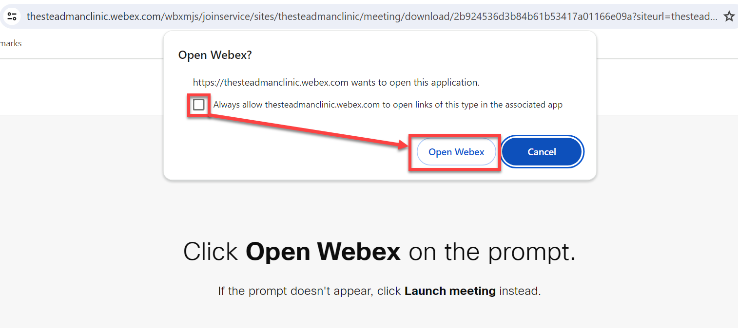 Step 8. If Webex is installed and you are signed in. Select Open Webex.