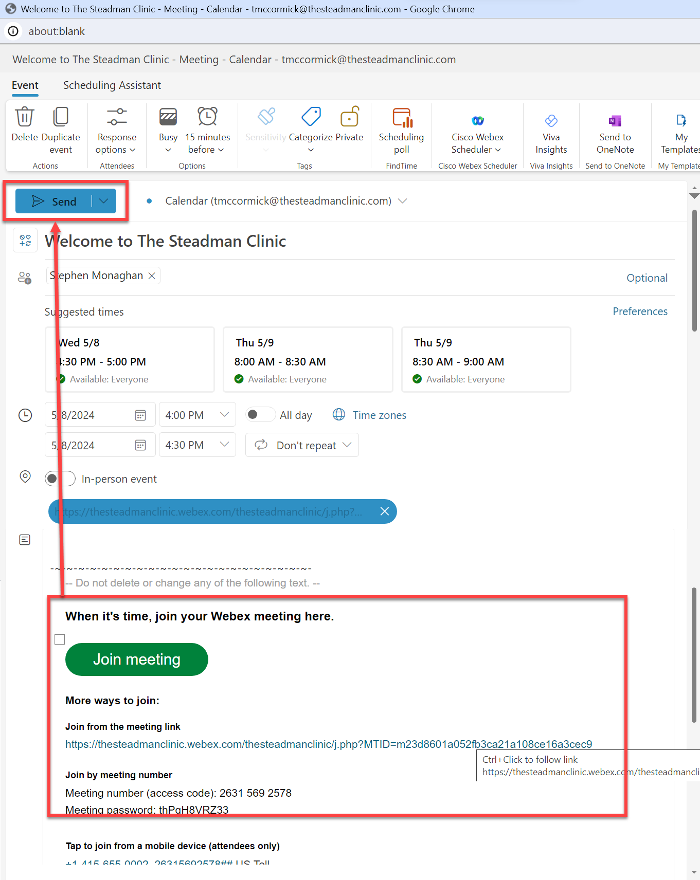 Step 6. Your Webex meeting information will be added to the meeting and appear on your calendar and in the Webex App. Hit Send.