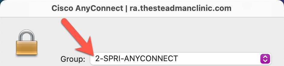 Step 3. For SPRI employees, the Group dropdown must match the image below, displaying 2-SPRI-ANYCONNECT.