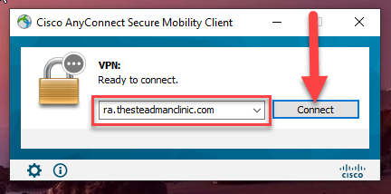 Step 2. In the resulting VPN window, ensure the server address in the dropdown reads 'ra.thesteadmanclinic.com' before clicking Connect.