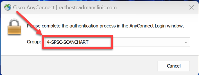 Step 3. For SPSC employees, the Group dropdown must match the image below; the username and password are what you sign into your PC with. Once entered, get your cellphone ready & then click OK.
