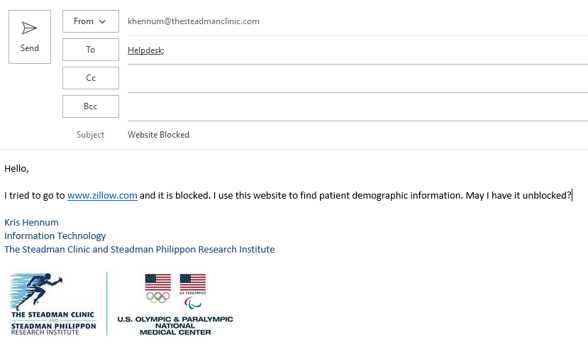 Step 2. Once IT creates the rule to allow access for that website, it takes 45 minutes for it to take effect. After the rule is created and the 45 minutes has passed, you will have access again.