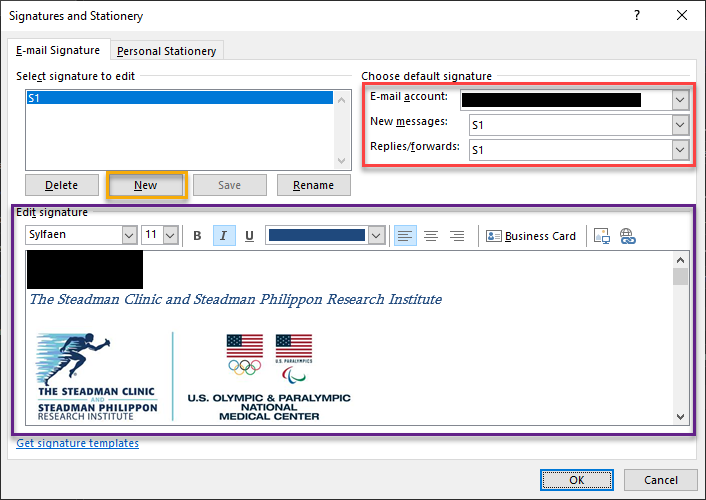 - The New button, indicated by the GOLD box, will allow you to create a new signature.
