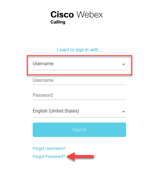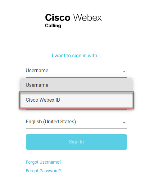 Step 2. Click the dropdown highlighted by the red box in Step 1, and select Cisco Webex ID; if you don't know your password, use the Forgot Password? link to reset it.