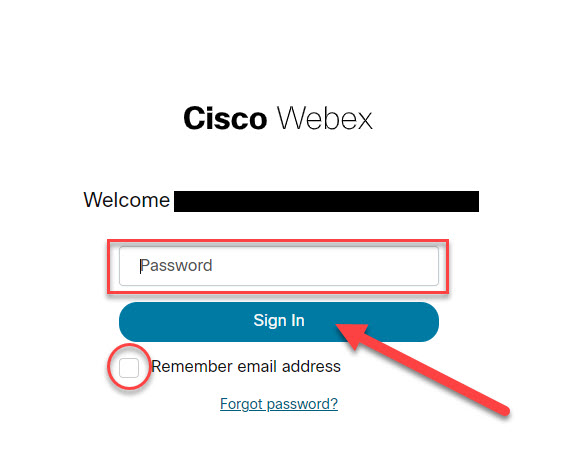 Step 4. Upon being brought to the following window, enter your WebEx password into the field as noted by the red box; if you're signing in using your own work PC, you can check the 'Remember email address' button. Once you've entered your password, click the Sign In button indicated by the red arrow.