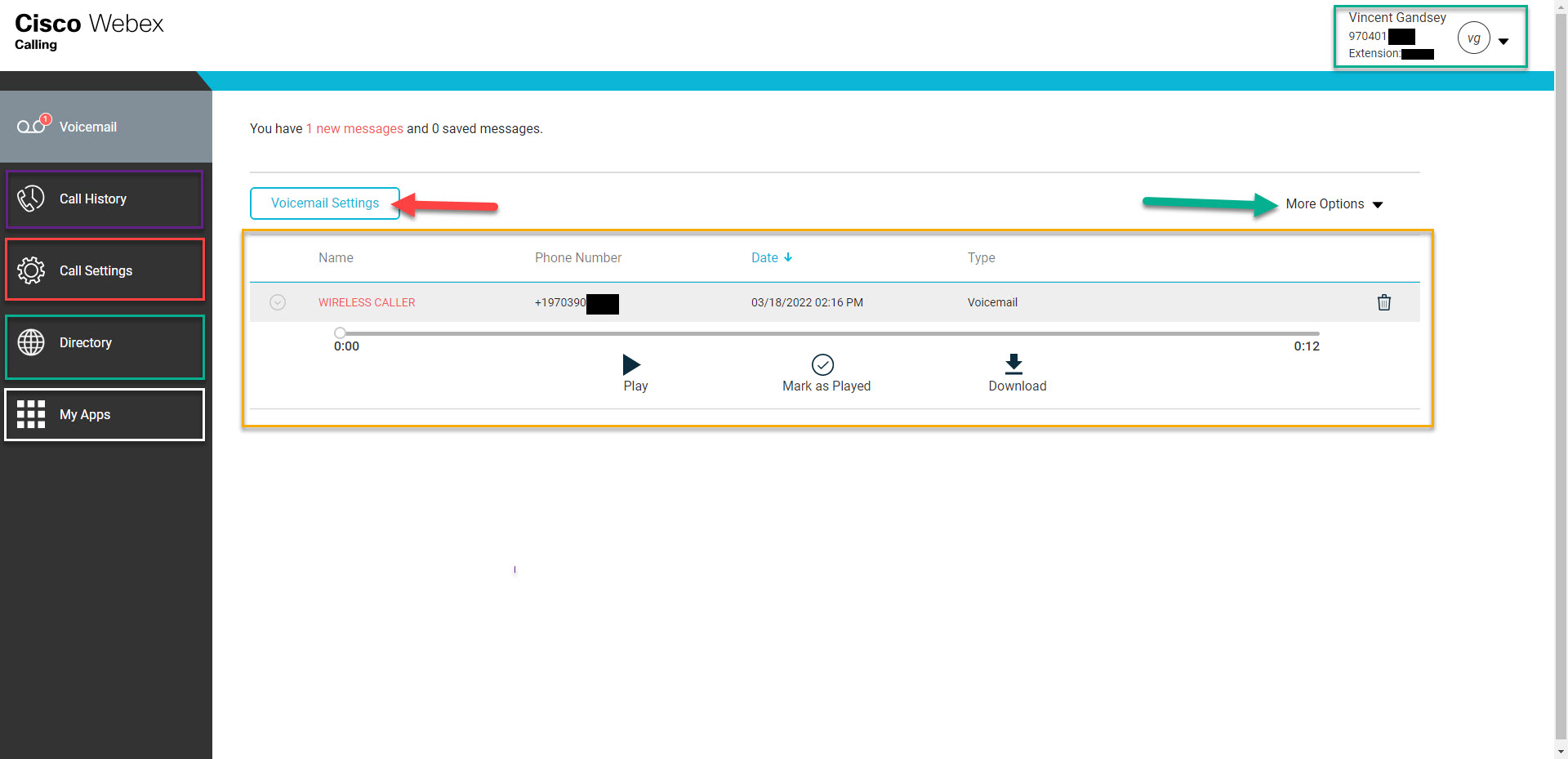 - You can find options to mark all voicemails as played, download all voicemails, and delete all voicemails under More Options, as noted by the green arrow.