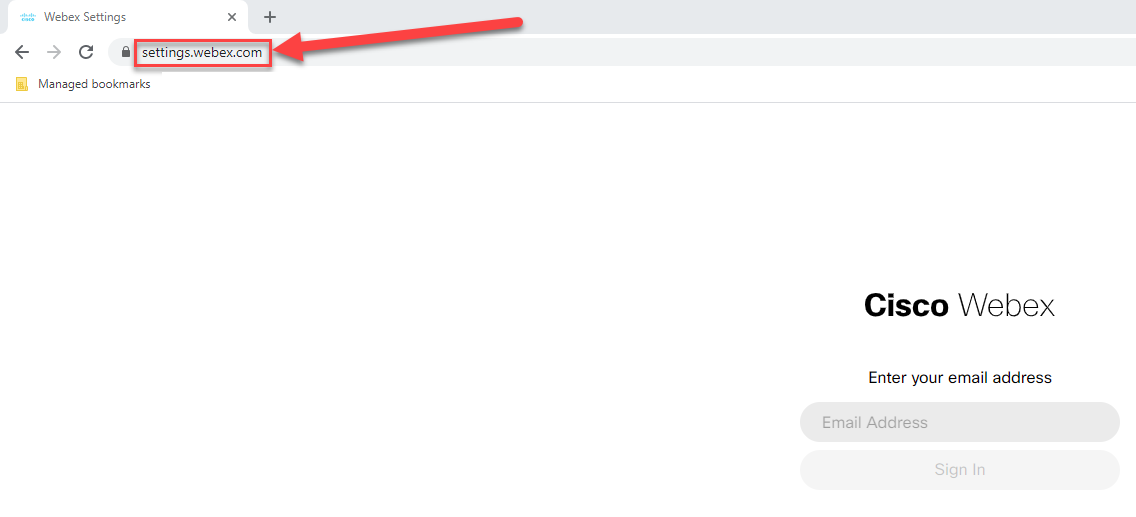 Step 1. Within Google Chrome, navigate to settings.webex.com via the address bar.