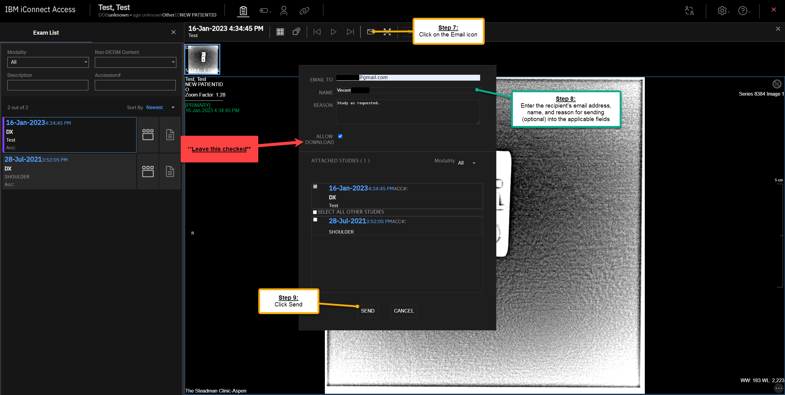 Steps 7, 8, & 9. Click the Email icon to the right of the study date and time, then enter in the recipient's email address, name, and reason for sending; the third part is optional, but may be helpful to provide clarity should the patients need it. Once you've entered in the appropriate info, click Send.