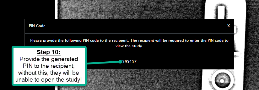 Step 10. Important!! The final step is to provide the one-time generated PIN to the patient; without this PIN, they will be unable to access the study you sent them. For security, the PIN is not provided with the study, meaning you will have to get them the PIN independent of the system-generated Email containing their study.