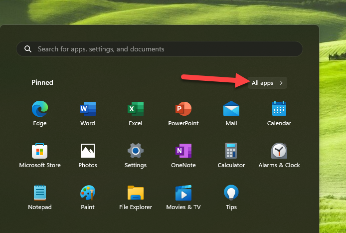 Step 2. In the resulting menu, click the All apps button, as noted by the red arrow.
