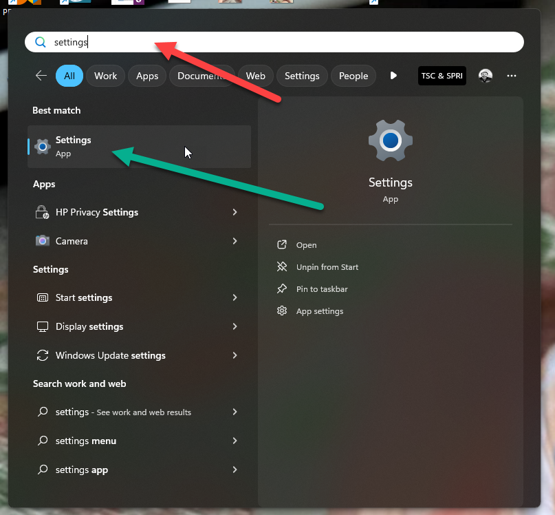 Step 2. Within the resulting Start menu, simply type the word "Settings" as denoted by the red arrow; then, either click Settings as denoted by the green arrow, or simply hit the Enter key on your keyboard.