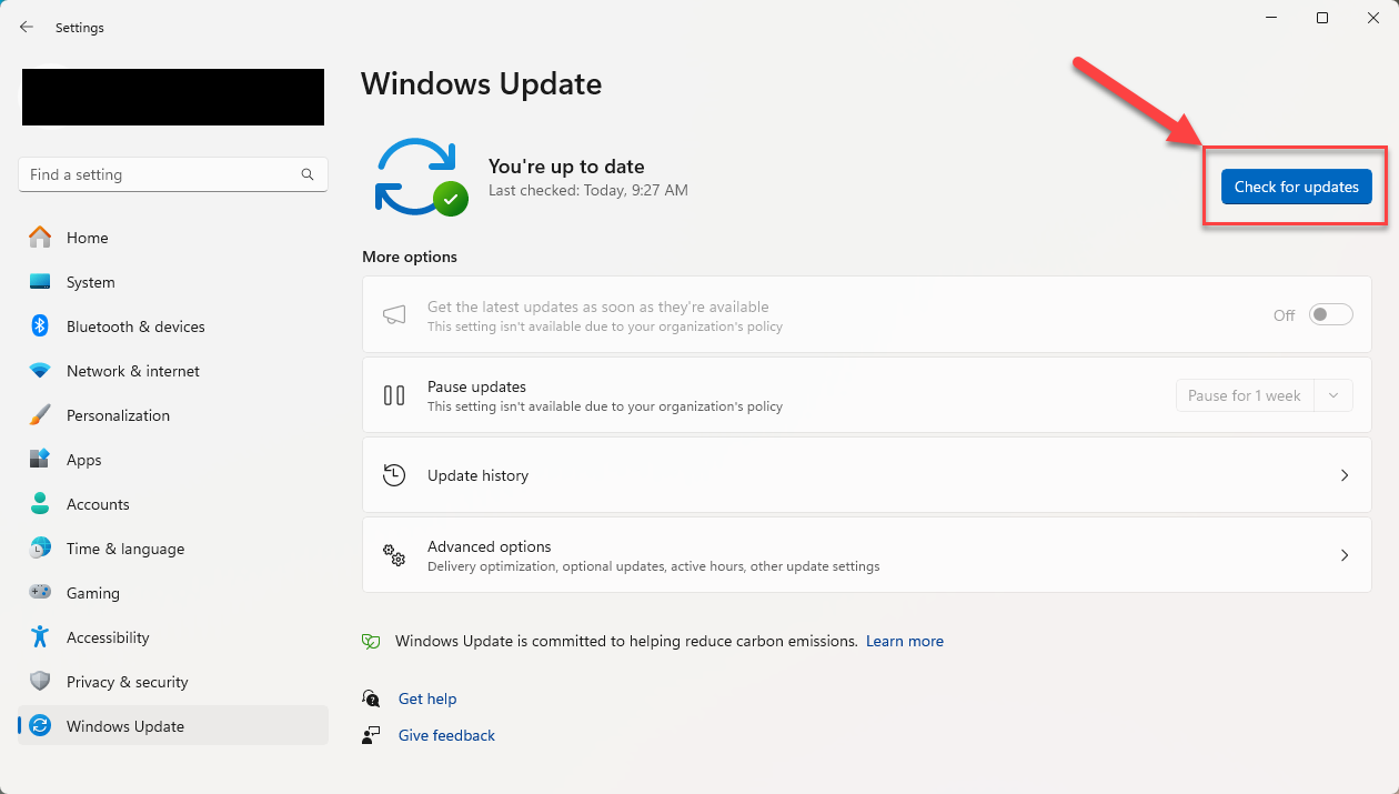 Step 4. Upon reaching the Windows Update screen, click the "Check for updates" button as denoted by the red box/arrow. This will prompt your PC to request outstanding updates from Microsoft, many of which can be run in the background without interrupting your work. If any of the updates require a restart, you will be prompted to do so, and it's best to do so as soon as possible.